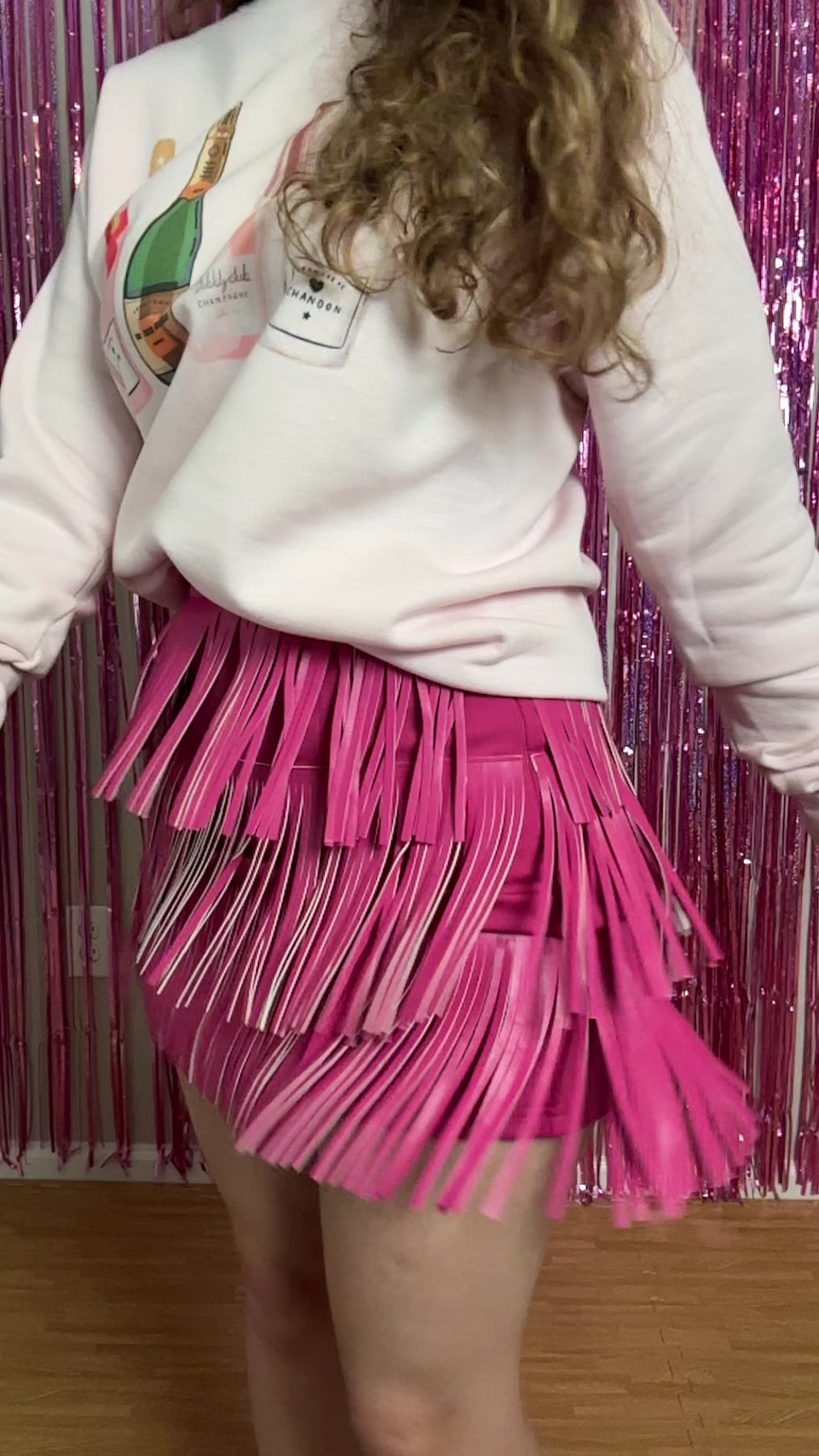 Pink, faux leather, fringe mini skirt.