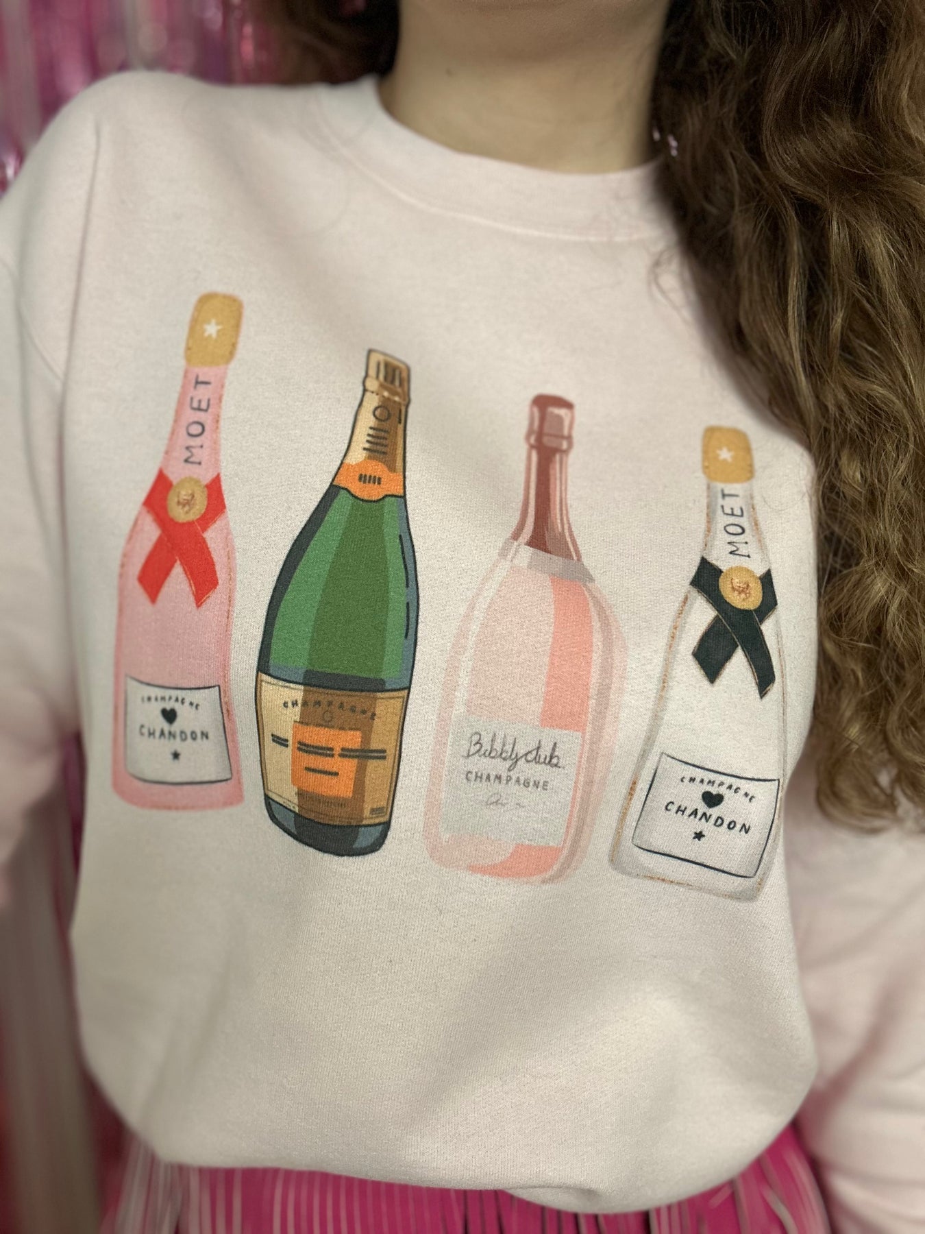 Champagne bottles crewneck in a very pale pink color. Great tucked or left untucked.