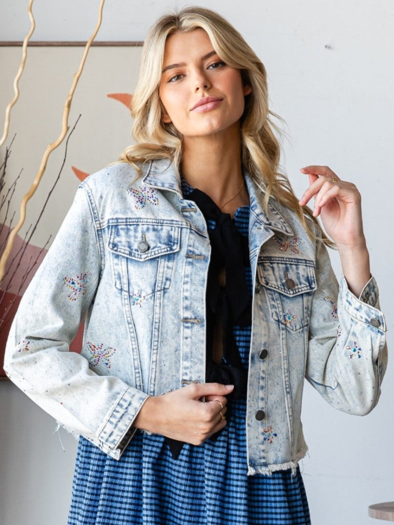 Light-washed denim jacket with multi-colored rhinestone butterflies. The jacket is cropped, long-sleeved, and has a frayed hem.