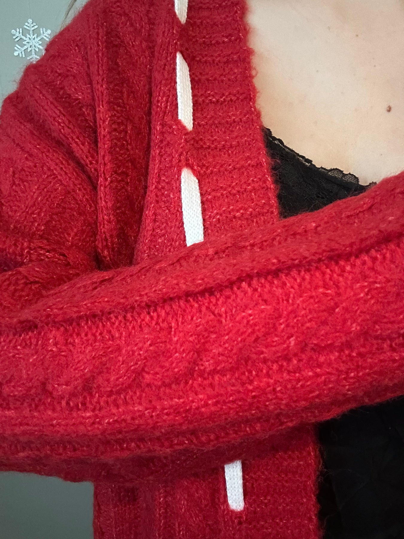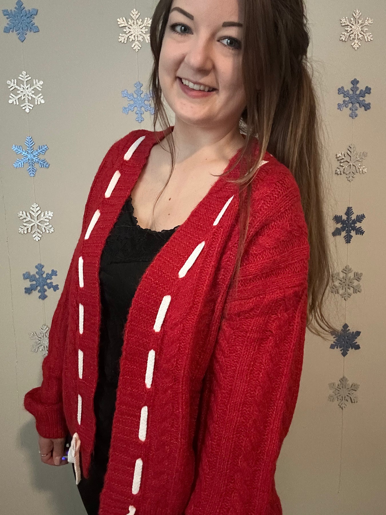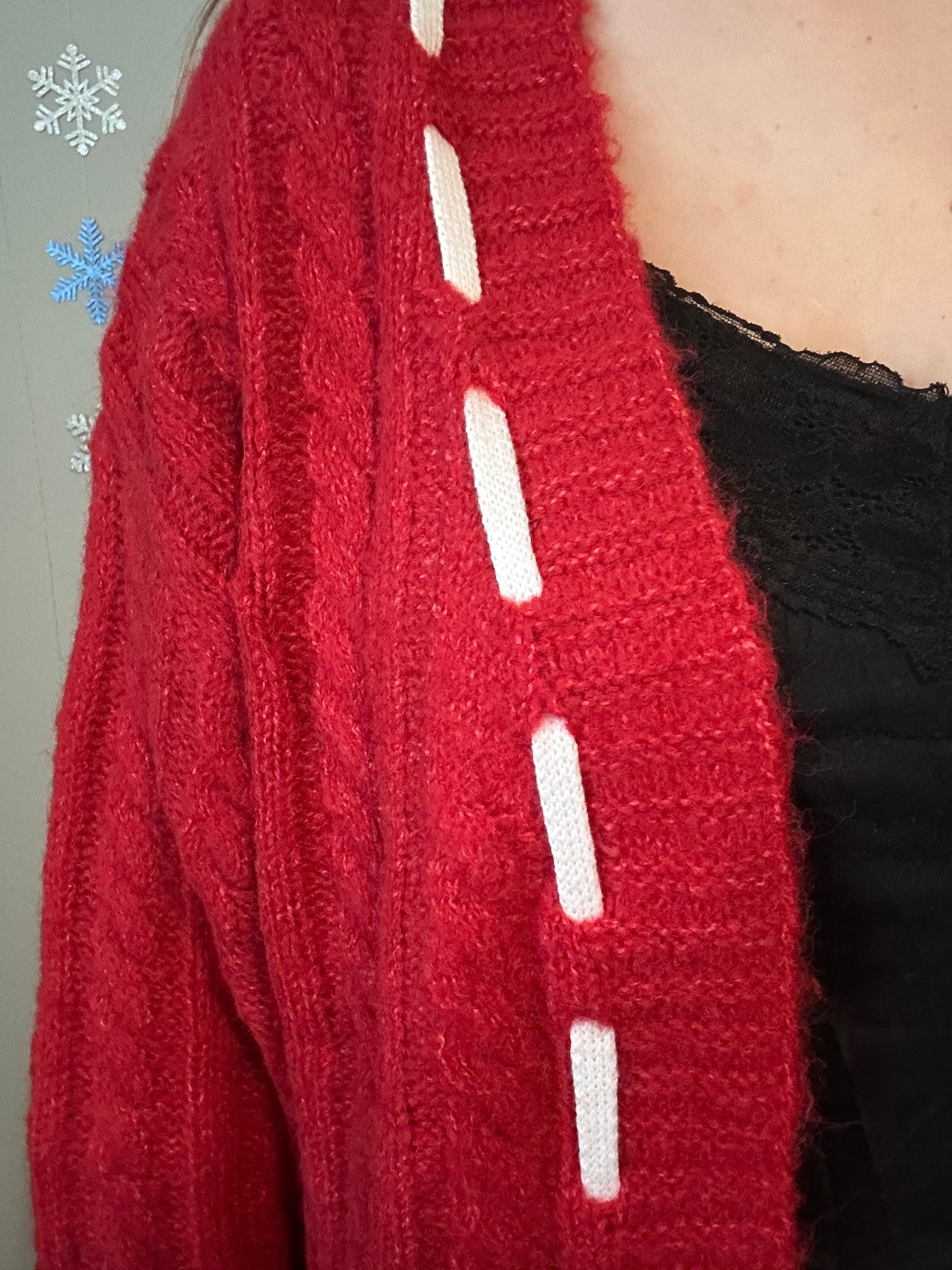 Layer on holiday cheer with this cute, red sweater cardigan. The cardigan features a white, tie detailing.